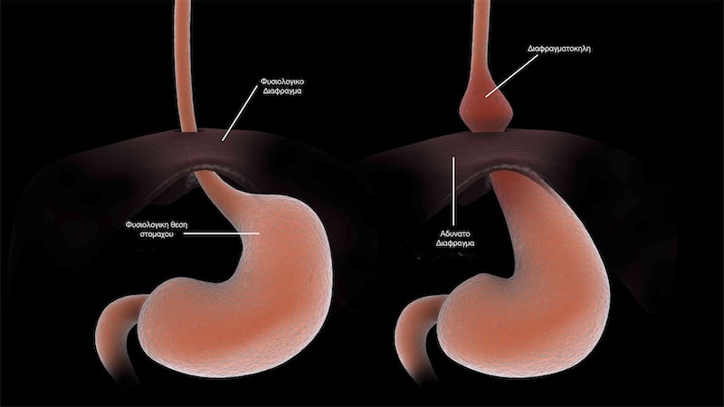 στο μεσοθωρακιο και οι παραοισοφαγικες κηλες στις οποίες η Γαστροοισοφαγική συμβολή παραμένει στη θέση της αλλά μέρος του στομάχου (θόλος) ανέρχεται στο μεσοθωρακιο.