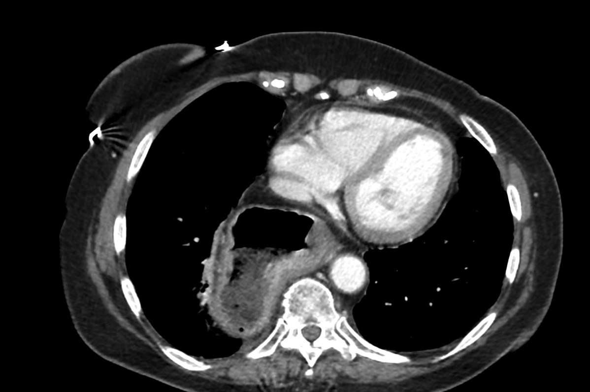 3) Αξονική τομογραφία ύστερα από κατάποση γαστρορραφινης,εξεταση που μας επιτρέπει να διαγιγνώσκουμε τον τύπο της διαφραγματοκηλης